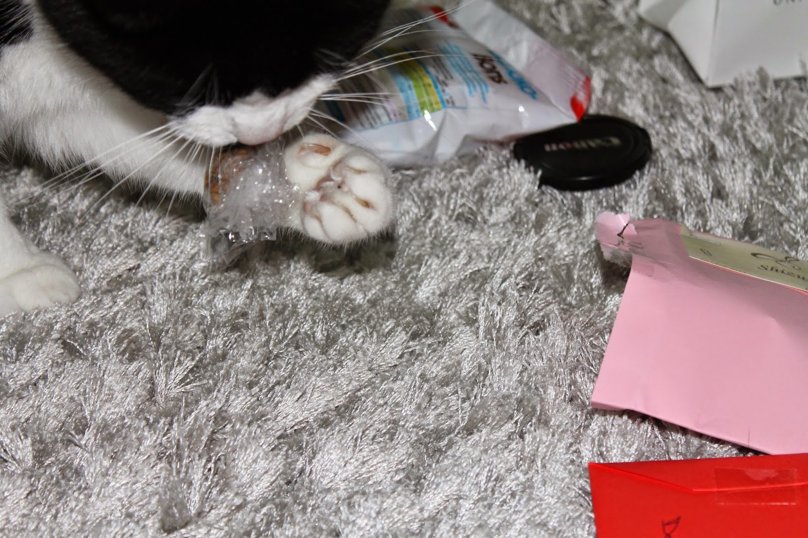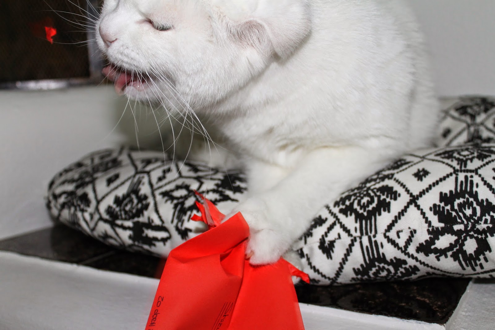 Este ano, além de todas as coisas para a mesa (que vou mostrar nas fotografias abaixo) ela fez uns pequenos embrulhos e umas cartas com uns cartões para oferecer ao dono mais velho, aos pais, á tia e ao tio, à avó, a mim e ao Nobita. Como podem ver nas fotografias eu não estava nada interessada na carta. Ela deu me o envelope (todo mal feito) e eu calmamente dei-lhe o destino que ele merecia. Destruí-o completamente. Com as minhas unhas e os meus dentes triturei-o! Infelizmente a minha dona conhece-me um bocadinho bem demais e tirou o cartão de dentro do envelope, segundo ela: "já sabia que ias fazer isso e guardei o cartão gata doida". Doida, eu? Que falta de respeito.